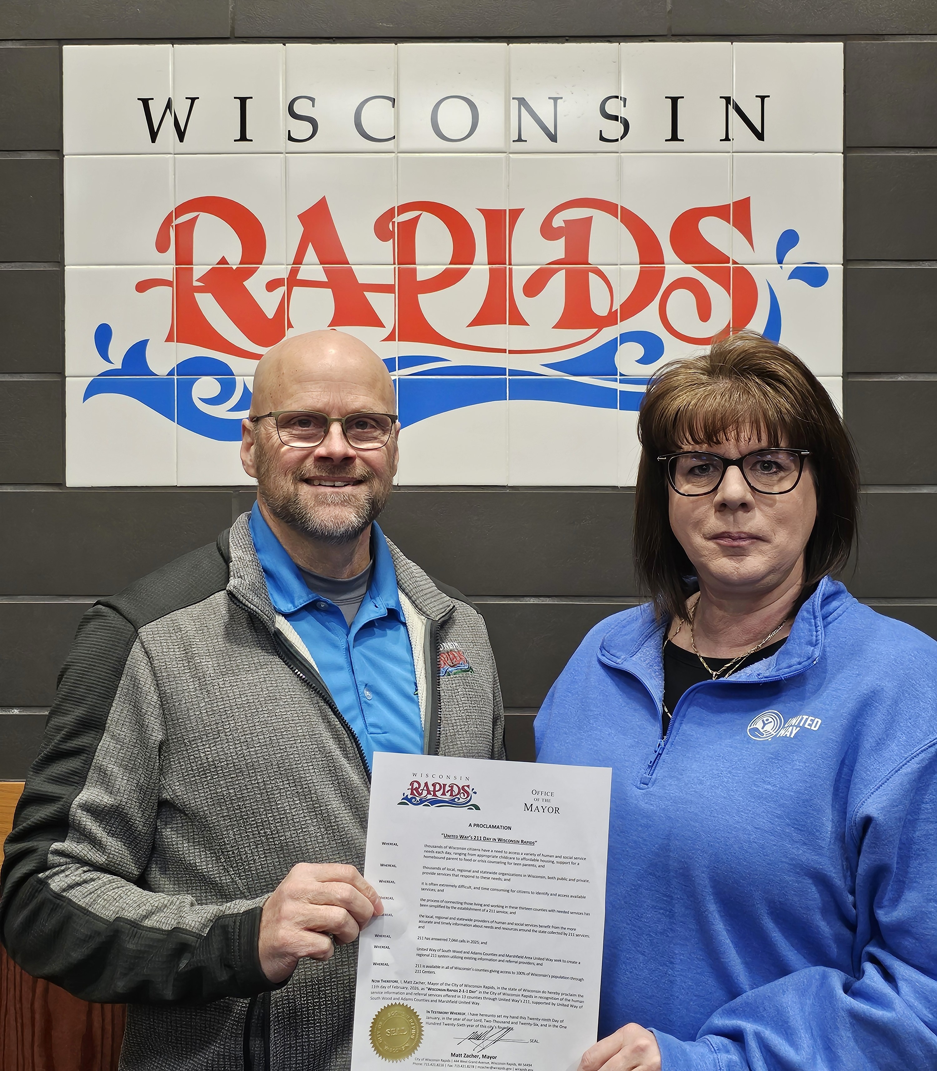 Wisconsin Rapids Mayor Matt Zacher recently proclaimed February 11, 2026, “211 Day.” Pictured here are Danie Schalk, 211 Program Director, and Mayor Zacher.